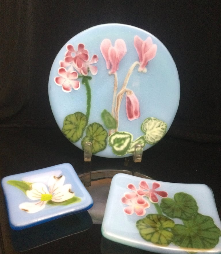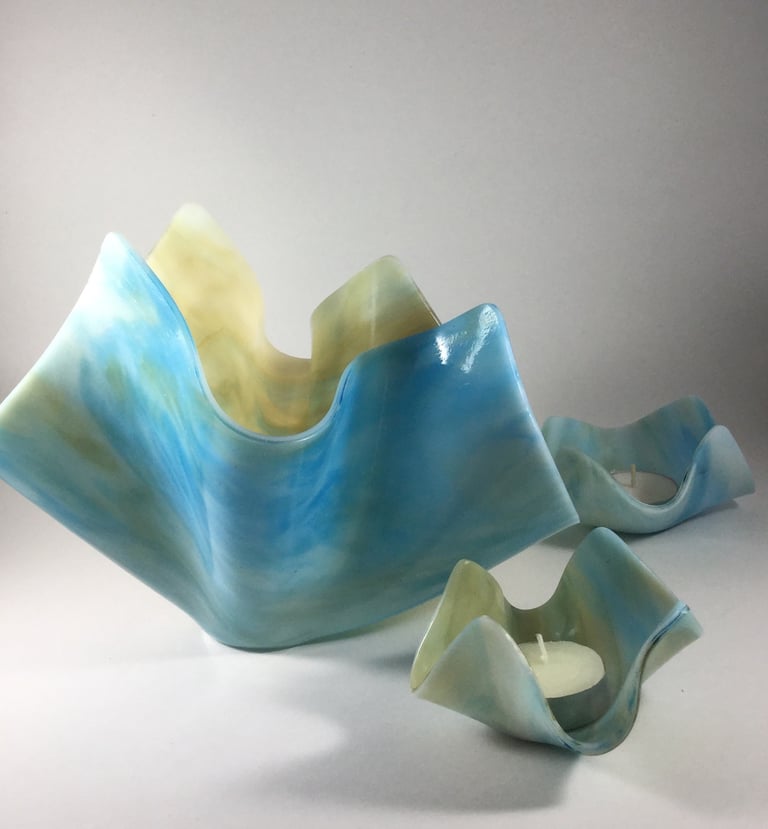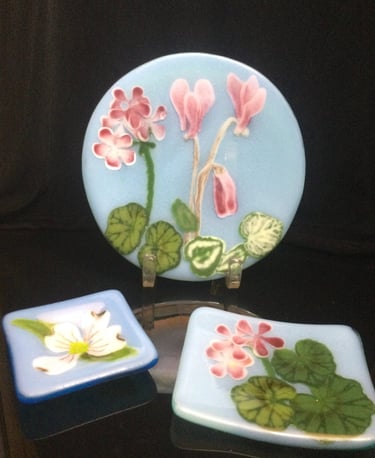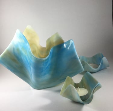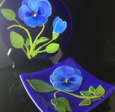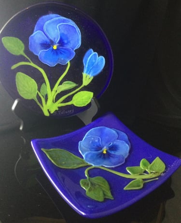 The process of fusing glass involves several steps. Glass is first cut and ground to a desired size and shape from large sheets of colored or clear glass. Several pieces of glass are often stacked or layered to mix colors or create the desired design. Sometimes, powdered glass is used to add elements of the design. Metals, such as 14 karat gold, pure silver, copper or palladium are sometimes placed between pieces of glass becoming permanent inclusions. After the design is finalized, the glass is heated to a processing temperature- usually around 1475 degrees. At this temperature, glass fuses or melts together and becomes a flat surface. Sometimes, a lower temperature is used to provide texture to a piece. To change the shape of a fused piece, a second process, called slumping or sagging is done. At this step, the glass is laid over a mold and carefully melted and cooled at precise rates. Sagging and slumping occurs around 1250 degrees. During this stage, bowls, vases and sculpted pieces are formed into their finished shape.